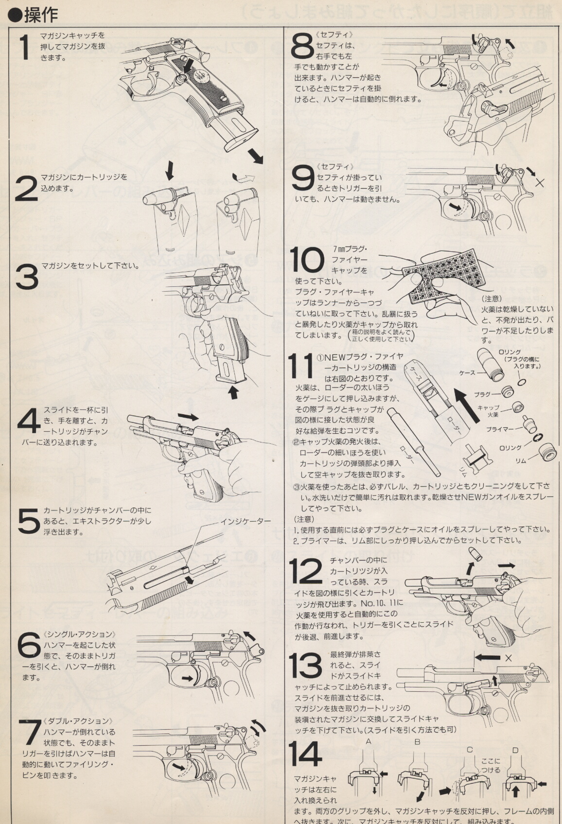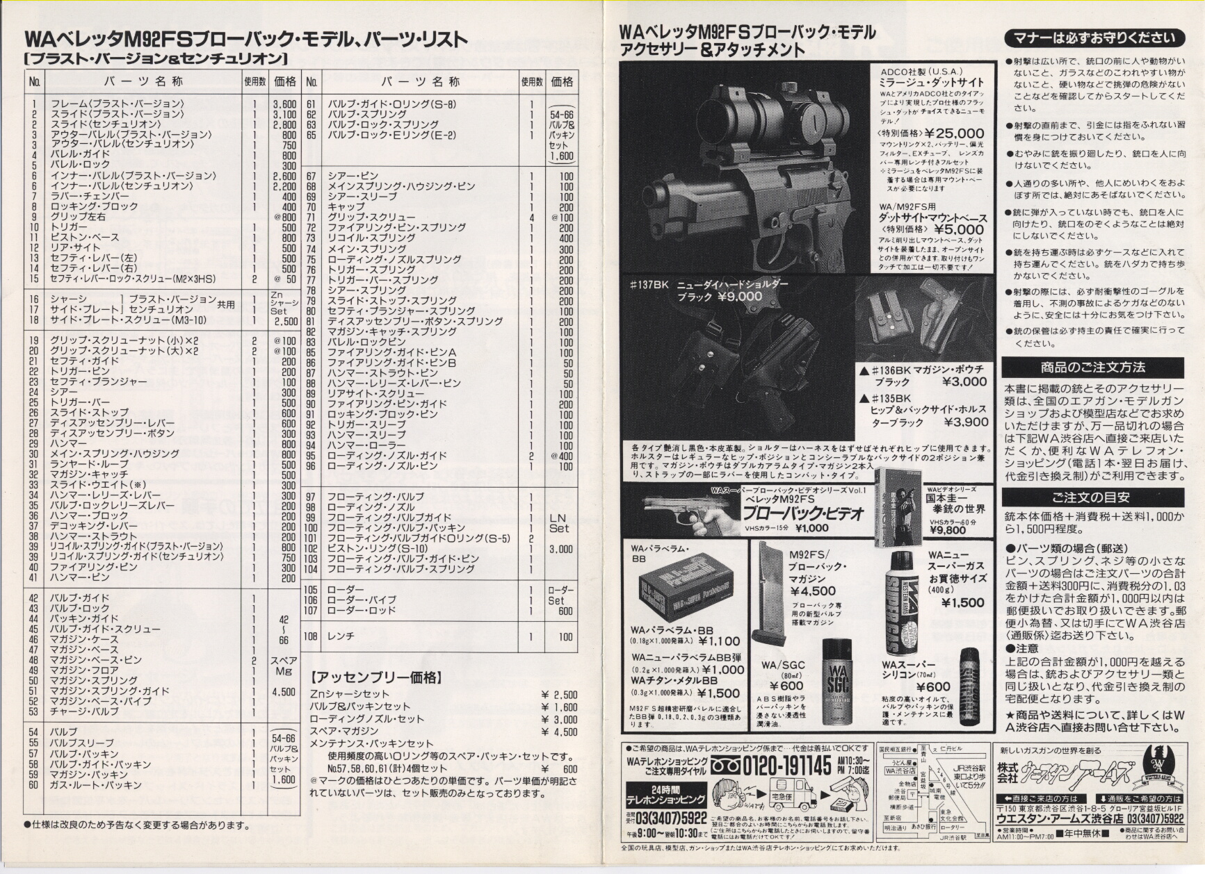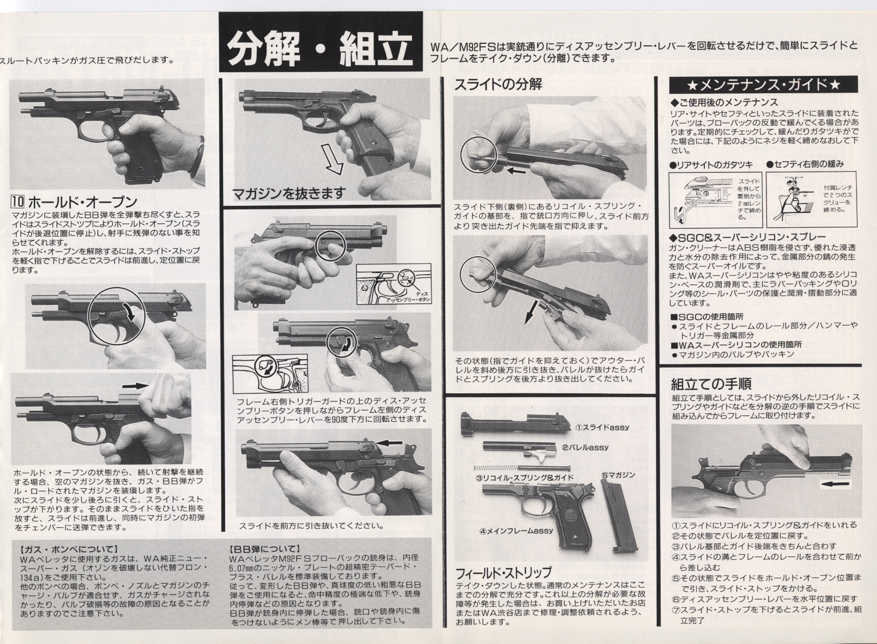 今回はウェスタンアームズのガスブローバックガン、ベレッタM92FSセンチュリオンのマニュアルです。センチュリオンの付属マニュアルですが普通のM92FSと共用のようです。WAのセンチュリオンはヘビーウェイト樹脂で仕上げも美しいものが最近のものでありますが、これは90年代中頃の初期のもの。四半世紀も前のものとはいえモデルガンさながらの通常分解ができて固定ではあるもののHOPUP搭載、ブローバックエンジンがスライド側にあるプレシュートと機構はほぼ完成されており、この銃の登場で実銃同様の分解ができず着弾も大幅に下寄りだったアフターシュートのブローバックガスガンを一気に陳腐化させました。