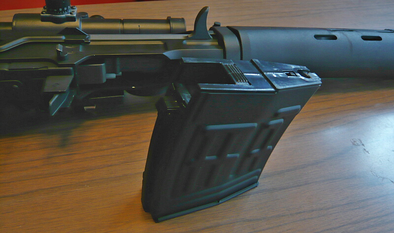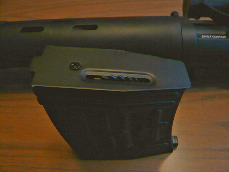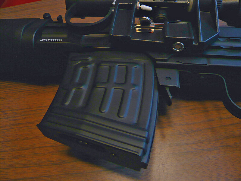 マガジンは金属製のものが付属します。マガジンポート内後方にメカボックスが大きく張り出しているので、マガジン上面後部に大きめの逃げがあります。このマガジン自体はエアコキSVDと共通?RSやCYMAのは上面が真っ平で給弾位置が真ん中にあるので互換はありません。
