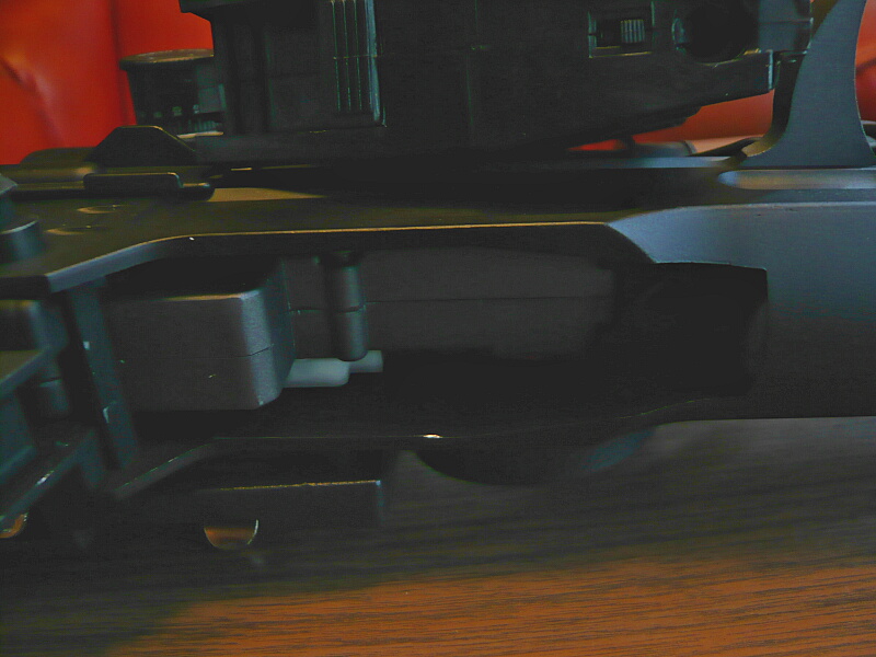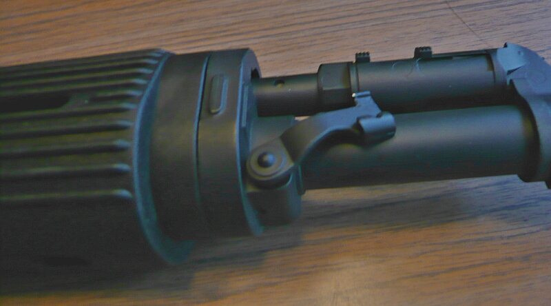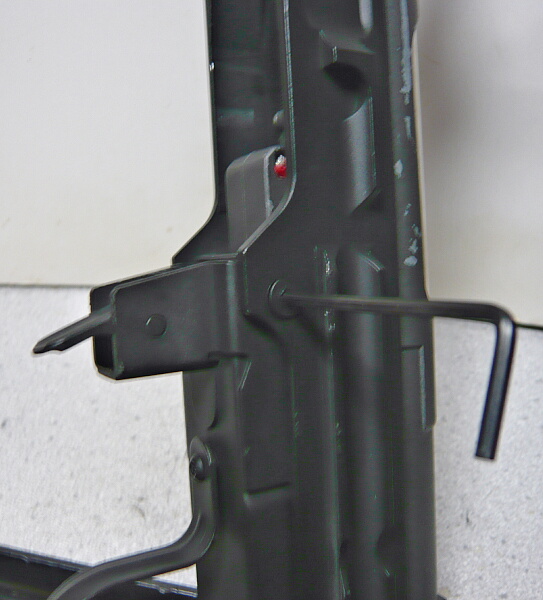 レシーバー右側にはストックを折り畳んだ時に掛けるロック部分が突き出ており、ストックを畳んだ時はチークピースの後ろのスイッチをここへ掛けます。この突き出たパーツはセレクターを一気に下へ下げた時のストッパーも兼ねています。