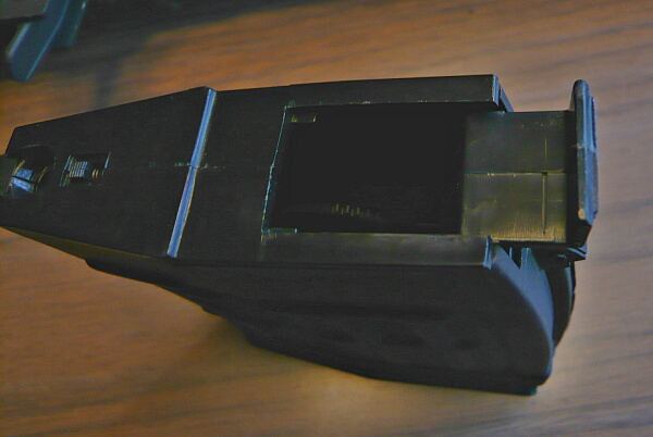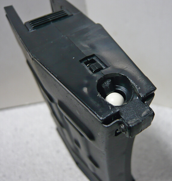 付属のマガジンは220連の多弾マガジンで、BB弾は上面後半の逃げの前端に爪を掛けてフタを開けて流し込みます。このフタは固いのでフタの左右面の突起を少ーしヤスって軽く開けられるようにしておいた方が良さそう。
