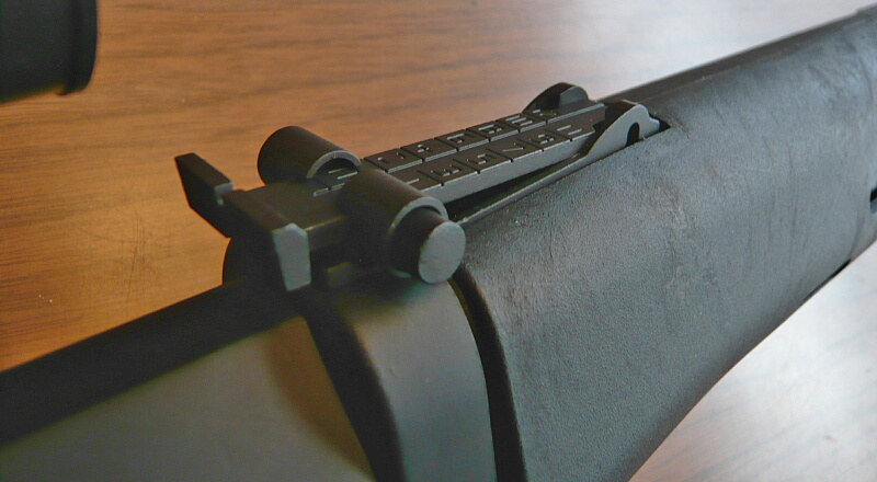 ボタンを押しながら前後にスライドさせる事で、リヤサイトの高さを調整する機能があります。