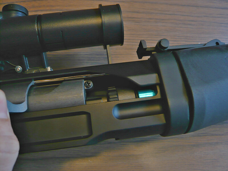 コッキングレバーをいっぱいに引いたところ。ストロークは長く、セーフ位置にしたセレクターの前端の窪みに当たるところまで後退します。エジェクションポート内にはバレル同軸のホップ調整ダイヤルがあります。ダイヤルは軽く回せるのですが、この銃のホップチャンバーはかなりの難物と聞きます・・・