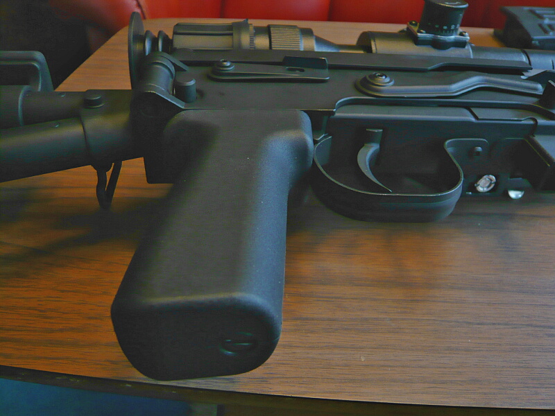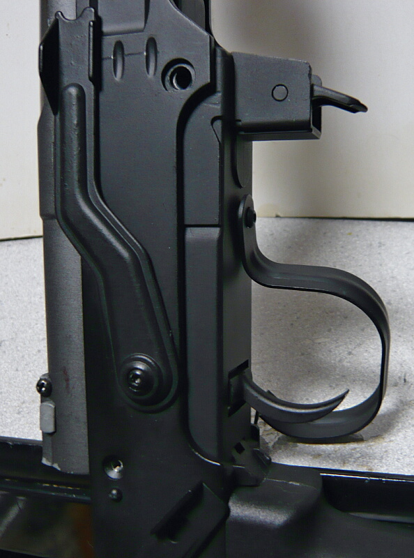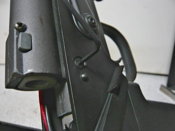 トリガー、グリップ。トリガータッチは特にクセなどはなく、普通の電動ガンのトリガーです。グリップはRSやCYMAとは違いグリップ内にモーターが入らないためあちらよりもグリップ形状は実銃に近くなっています。細くて握りやすいですが滑り止めが無く、重い銃をグリップだけで保持するには少し頼りなく感じるかもしれません。