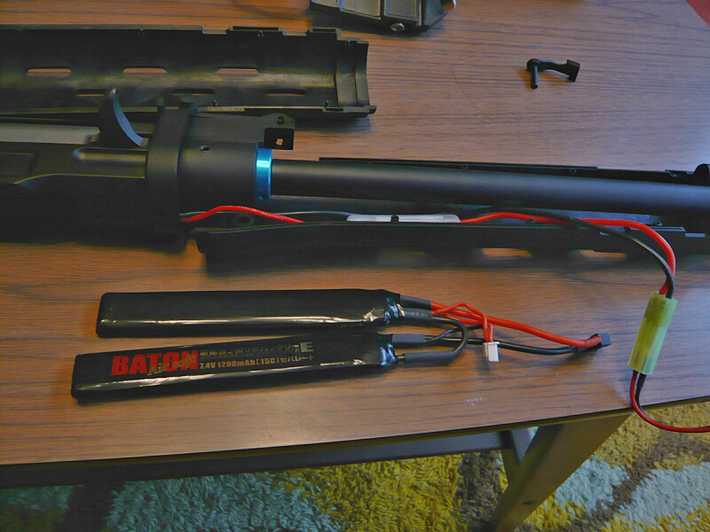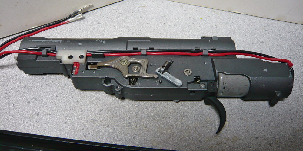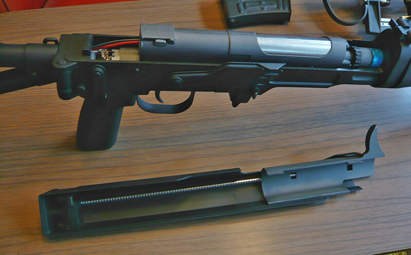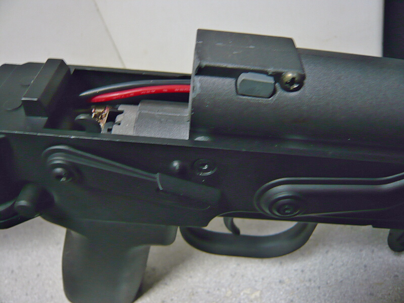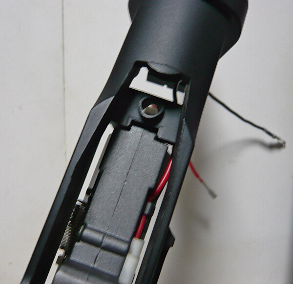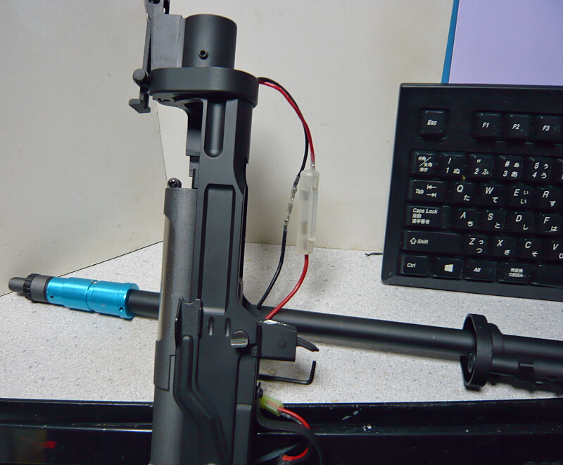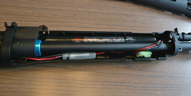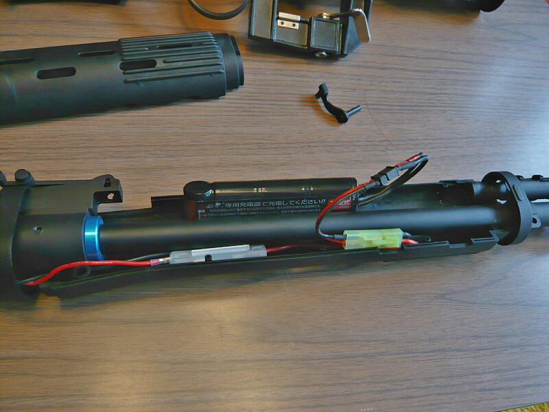 ハンドガード後端がレシーバーに刺さっているのでハンドガードを前方へスライドさせ、前後ともフリーになったらハンドガードを左右に割ります。ハンドガードはダボで左右がハメコミになっています。ハンドガードを割って外すと配線が出てきます。バッテリー端子はタミヤミニタイプ。赤い配線の途中にはヒューズボックスがあります。