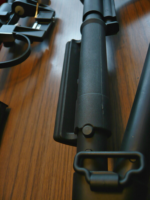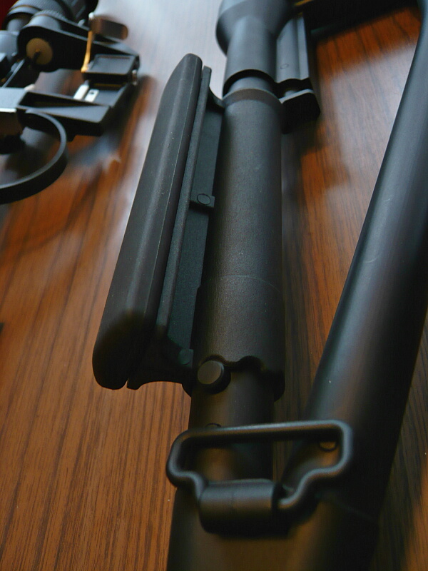 ストックはスケルトンストックのような形状ですがパイプは「鉄管」と呼べるほどゴツいもの。左側付け根にスリングスイベルがあり、パイプ上面にはチークピースが付いています。