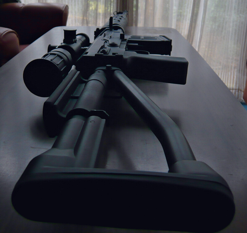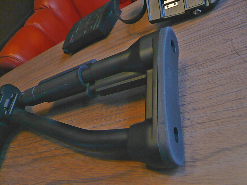 チークピースはストックを折り畳んだ時のロックボタンで前方へテンションが掛かっており、チークピースを後ろへ引っ張りながらパイプを軸にして回すことで角度を付ける事が出来ます。スコープを付けている時は上か頬の方へ向けておけば良いですが、アイアンサイトを使う時は邪魔になるので反対側へ向けたり、下へ向ける事も出来ます。チークピース上面はゴム製で頬への当たりに関しては「冷たい思いをせずに済む」大事な役割があります。