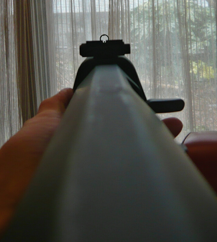 前後サイトの見晴らし。構えた時の顔からリヤサイトまでが結構遠いので近視だったりすると裸眼でサイティングするのはしんどいですが、ハンドガンの前後サイトと同様にサイティングする事ができるのでピープサイトよりもこちらの方が使いやすいと感じる人も多いのでは。