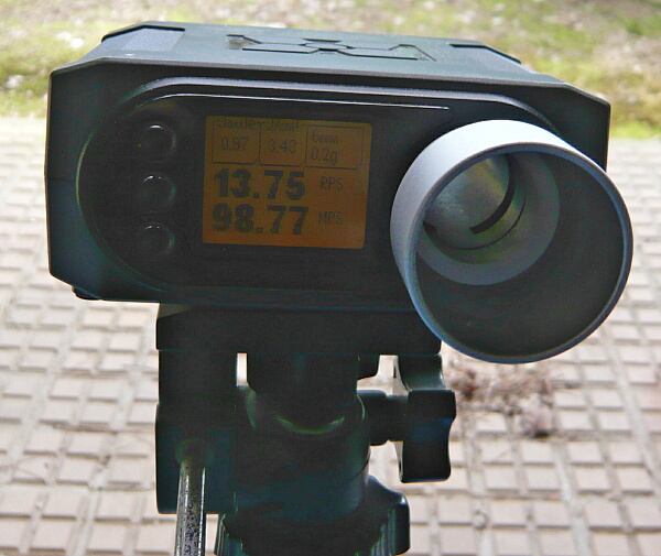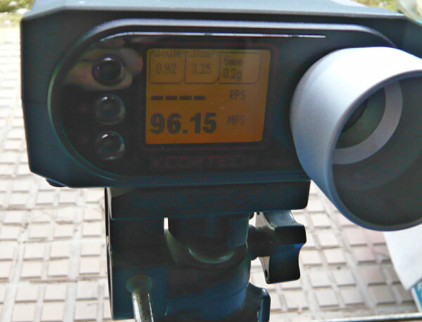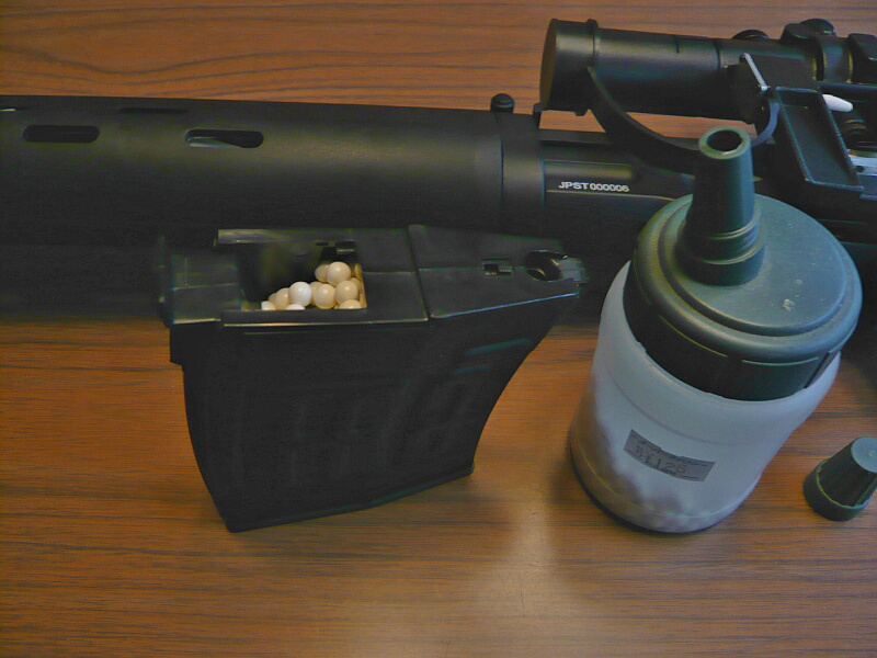 早速試射。マガジンのストッパー解除不良はほぼ改善されたようす。まっすぐ飛ぶようにホップ調整して初速を測ると結構高い。