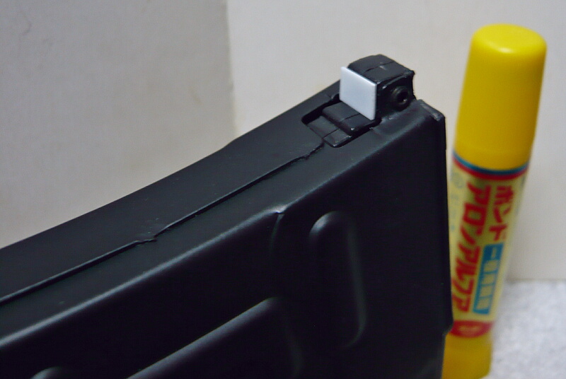 マガジン後面のレシーバーと当たる部分の、プラ製の部分に0.5mmプラ板を2枚貼り、更に0.3mmプラ板1枚を貼って微調整。前後方向のガタつきがなくなり、ストッパーの解除不良もこれで解消できている事を期待。