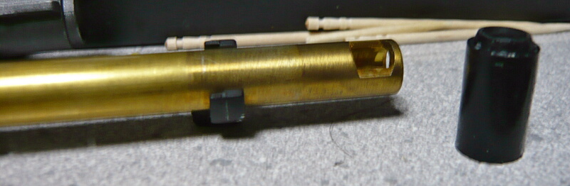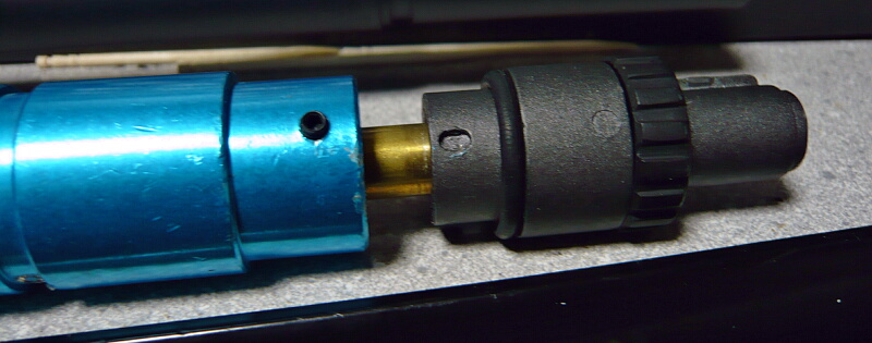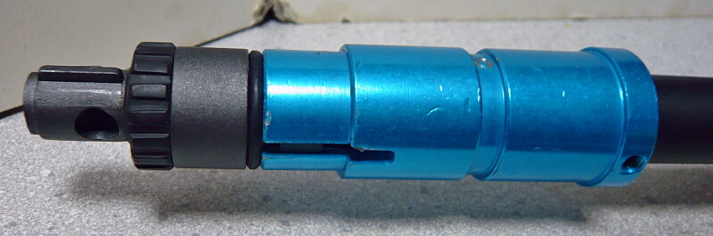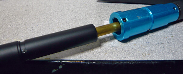 アウターバレル後端にはブルーアルマイト処理された基部があり、その後ろにチャンバーブロックが刺さっています。