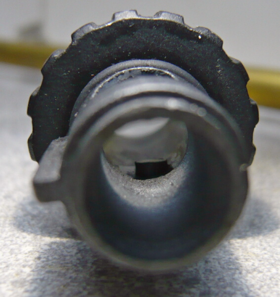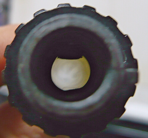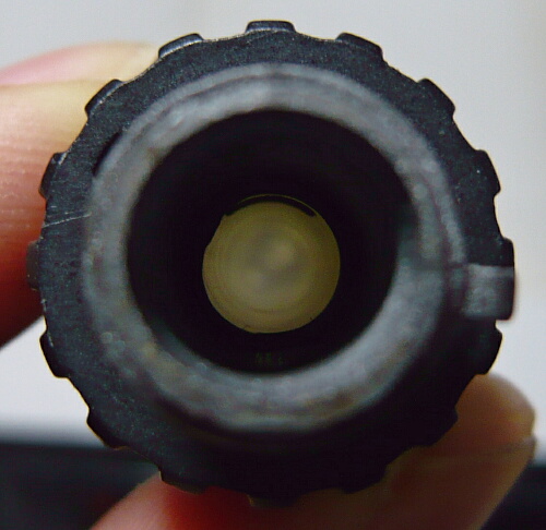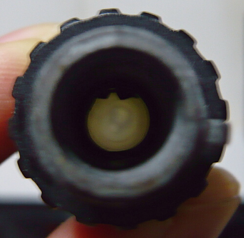 ノズルは樹脂製。黒い物が透けていますが内面が汚れているだけです。
