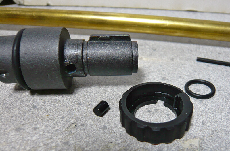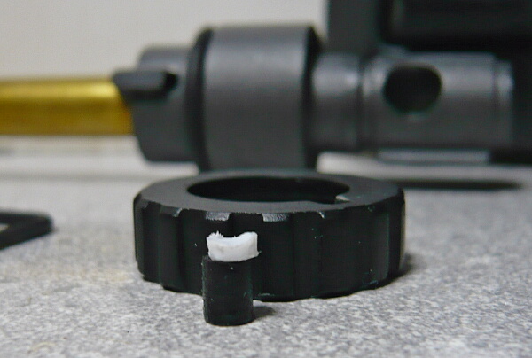 ホップ調整ダイヤルの前のOリングをずらし、ダイヤルもどけて押しゴムを外したところ。前回かさ上げのために入れたプラ板削り出しの部品がチャンバーとチャンバーパッキンの間に挟まってホップが弱まらなくなっていました。