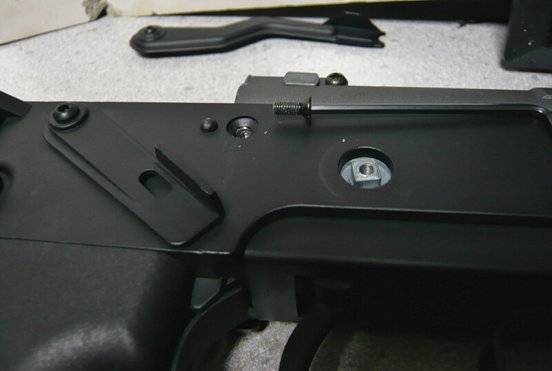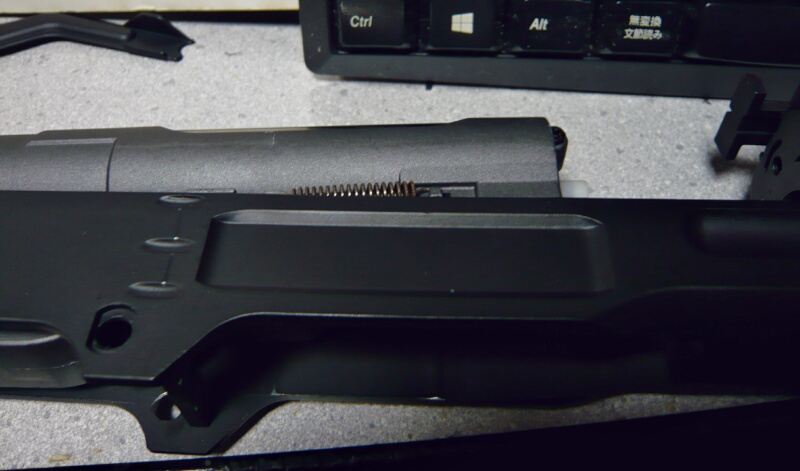 トリガーバー?を置き、ネジを締めます。このネジを締めすぎるとトリガーにトラブルが出ると聞きましたが、トリガーを取り付けてから引きつつ軽く動く限り締めてみたらガチガチに締めても平気だったので個体差もあるかも。スプリングがスヒュンスヒュン鳴くのでシリコンオイルを吹いたら静かになりました。