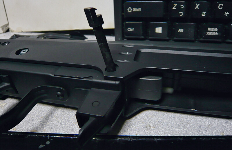 メカボックスをレシーバーの上から入れて後方から差し込み、前側を給弾口のうしろにある溝にパコッを収めます。