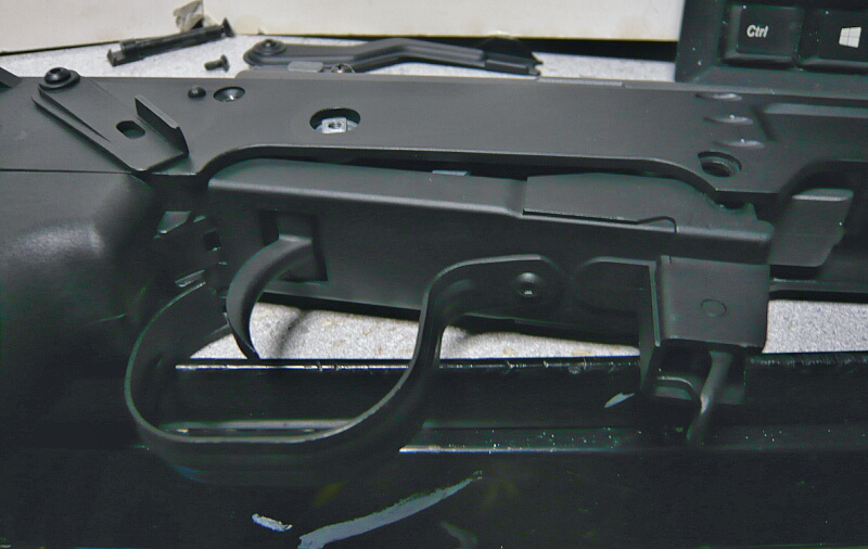 トリガーガードの後ろ側をグリップ付け根から抜いて横にずらしておき、マガジンキャッチの辺りを下へ引っ張るとレシーバー下側が外れます。