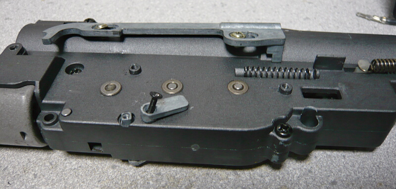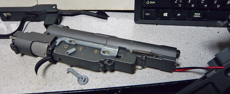 思ったよりメカボックス内のやる事は大体やってある状態だったのでこちらでやれる事はあまりありません。モーターは無いのでいずれやるとして、ギヤはストックしておいたSHSの13:1ギヤに換えてしまいましょうか。セミオート主体の銃のくせにサイクルの遅さからギュイッパンギュイッパンとレスポンスが悪いので・・・