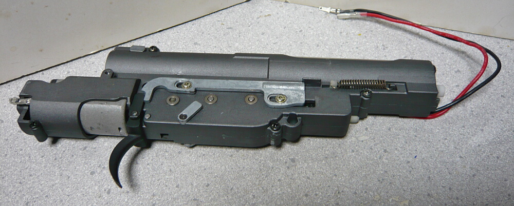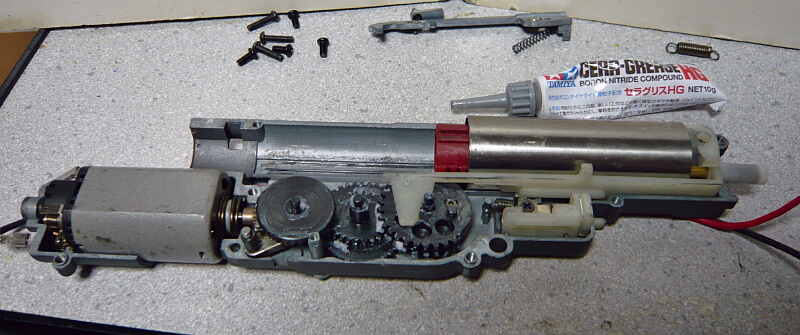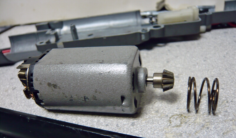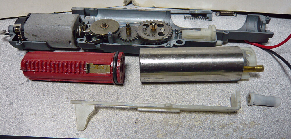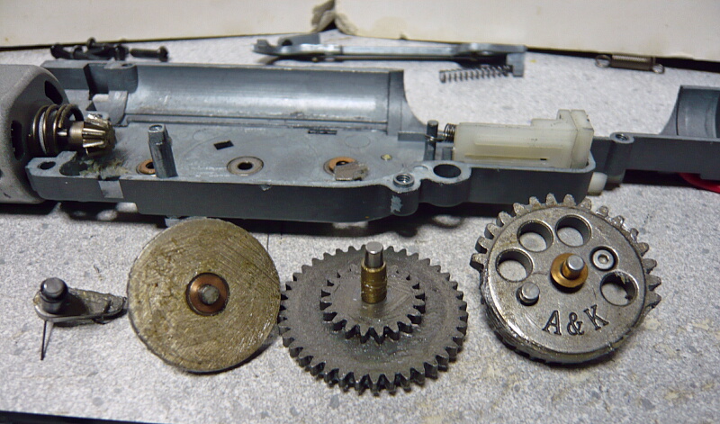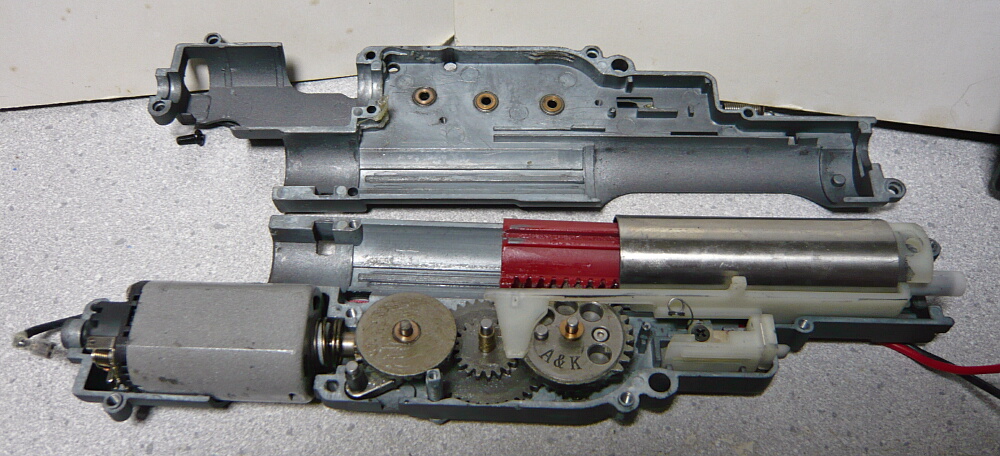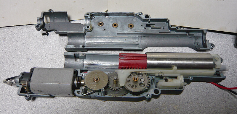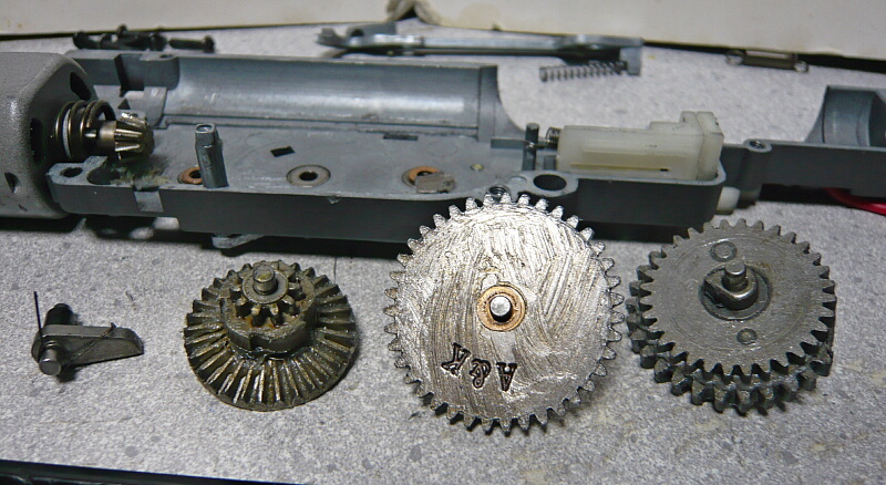 駆動系。3つのギヤと逆転防止ラッチ、ピニオンは普通の電動ガン用と互換があります。