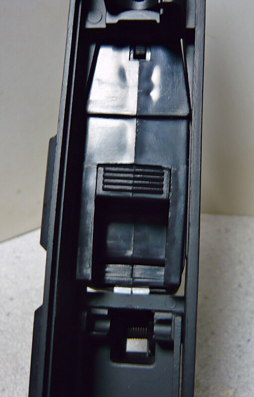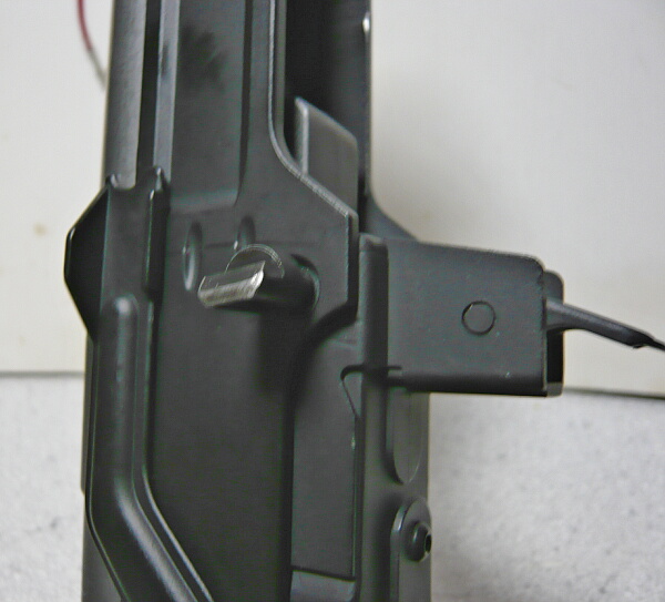 マガジンを前方に押すとストッパーのスイッチが少し後退し、この状態ならストッパーは解除できるでしょう。レシーバーとマガジン後面との間にわずかな隙間ができているので、ここを埋めてやればマガジンを普通に挿してもストッパーがすんなり解除されるかと思います。