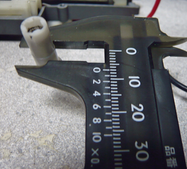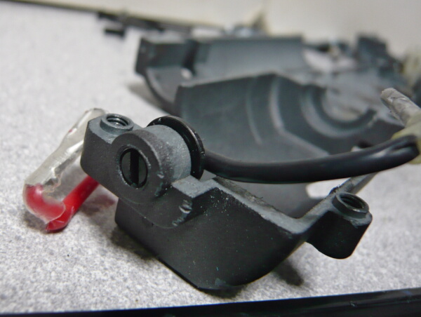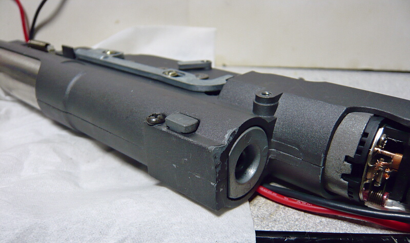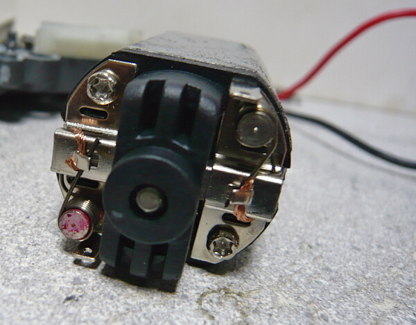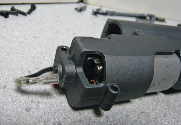プラス端子側が赤く塗られています。この灰色の机モーターは性能的には最高速もトルクも無いただの安物なのでマルイEG1000あたりに換えてしまうのが定番。