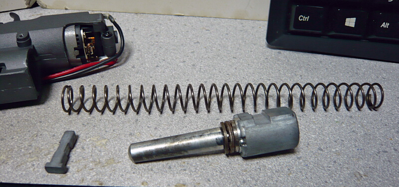 スプリングとスプリングガイドが抜けました。スプリングは汎用品だと思いますが、スプリングガイドは専用品でしょう。スラストベアリングの付いた金属製なので破損しない限り換える必要もありませんが、少し錆びているのが印象悪い・・・