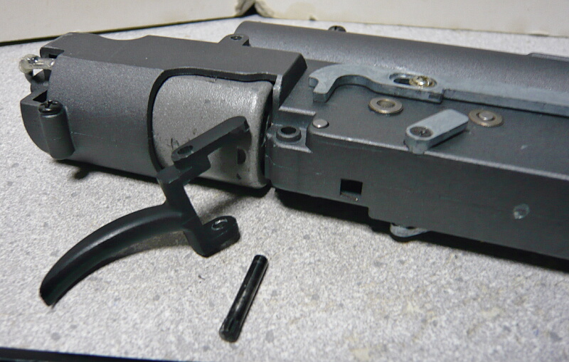 メカボックスを開けるには最低でもメカボックスを挟むように付いているものを外す必要があります。まずはトリガーピンを抜いてトリガーを外します。トリガーピンは一方にギザギザが付いていて抜く方向があるので注意。