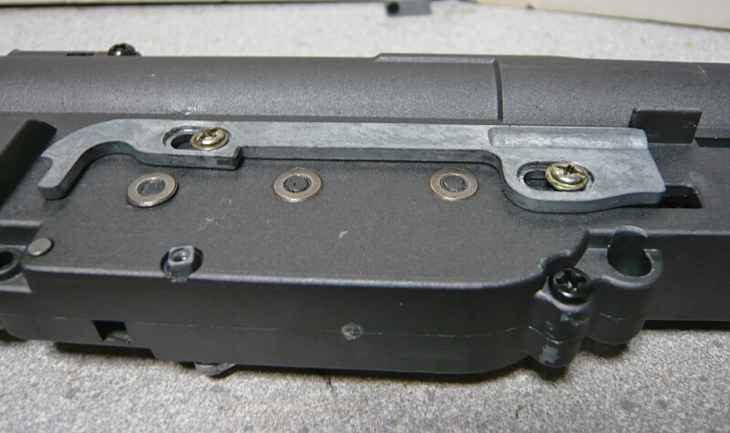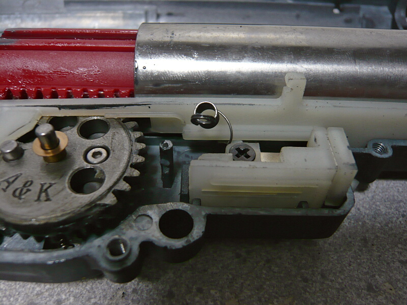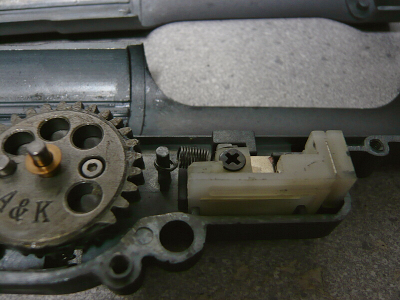 モーターの後ろが接する部分には調整ネジがあります。A&KのSVD-Sはストックを畳んだ時に露出されるレシーバー後面にこのネジにアクセスする穴があるので調整はしやすい銃ですが、メカボックスを開けないとモーター交換が出来ないかわりにピニオンとべベルの位置関係を面倒無く調整できるメリットもあります。