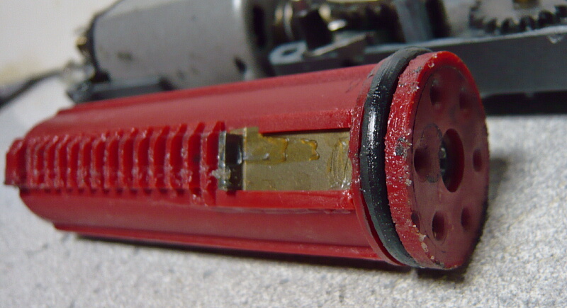 ピストンヘッドは樹脂製6穴タイプ。前方からネジを刺してピストンボディと結合しています。