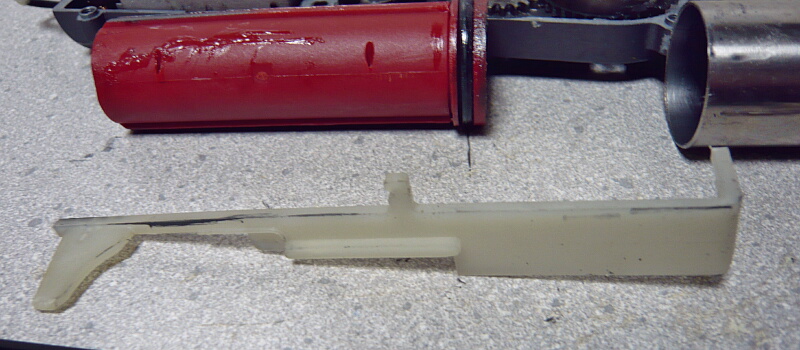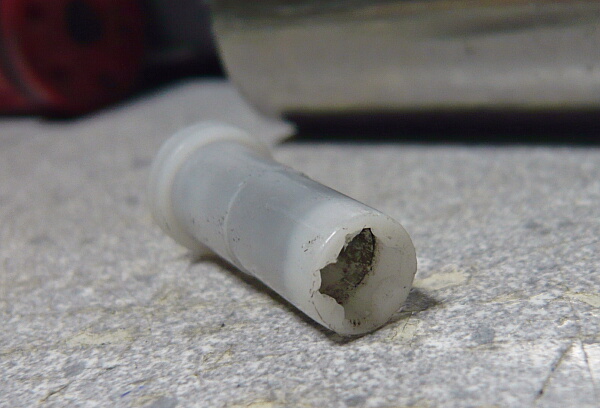 ストッパーを解除するのは銃側のチャンバー下の筒状の部分ですが、ここはチャンバーではなくレシーバーの一部なので金属製。丸の後端に打痕だけはあり、どうもストッパーの傾斜した面ではなく付け根の平らな部分に当たっているようなので、ストッパーの付け根を削って傾斜面とつなげてみますが、解決しませんでした。