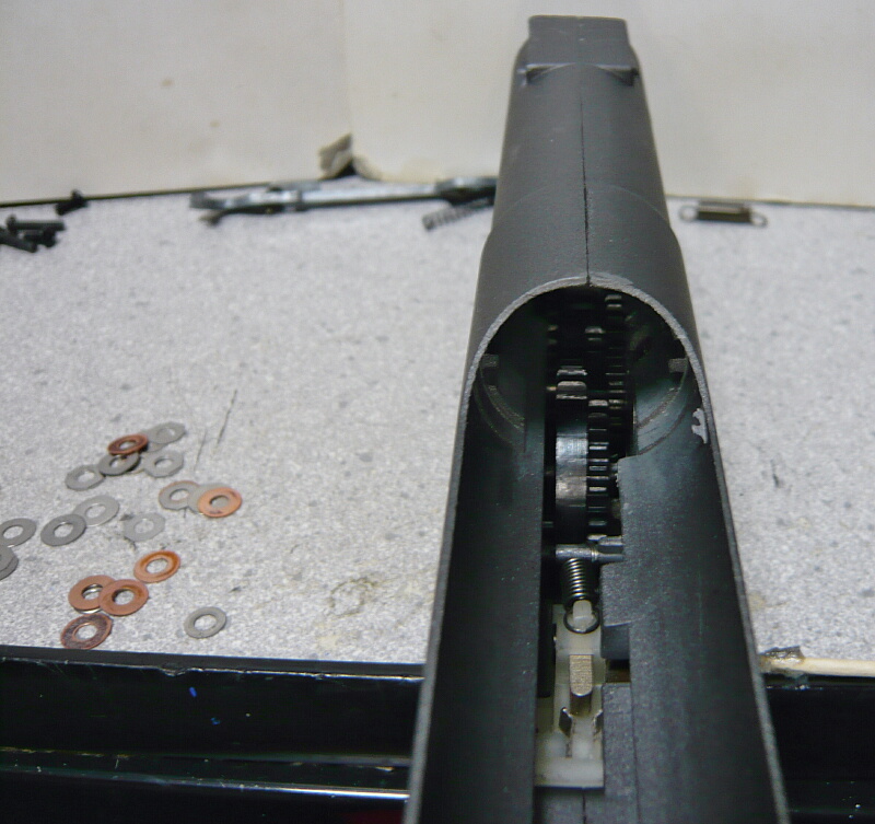下側からではギヤが見えず、シリンダーの入る開口部からセクターギヤくらいしか触れません。スパーギヤだけは左右が狭くてシムが極薄1枚ずつしか入らず、メカボックス内壁にショリショリ当たりがちになります。