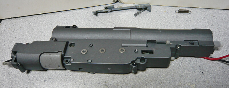 トリガーピンの前方にある斜めを向いたパーツはセレクターの動きをメカボックスを貫通して左側のパーツへ伝達するためのパーツで、これもネジを抜いて外しておきます。このパーツはフルオート動作を行うためだけにあるので、左右とも外すとセミオートオンリーになると聞きます。残る右側にあるめぼしいパーツは前後に伸びる金属パーツ。これはトリガーの動きをスイッチに伝えるトリガーバーです。セレクターがセーフ位置の時はこのトリガーバー下側の段差に引っ掛かってトリガーの動きを止めています。付いたままだと後の作業の邪魔なのでネジ2本を抜いて外しておきますが、長いスプリングが1本隠れているので失くさないように注意。