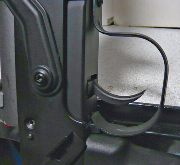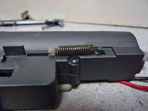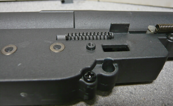 右側面の前方にはスプリングが外側に付いていますが、これは普通の電動ガンだとメカボックス内にあるタペットスプリングです。このメカボックスではタペットプレートの一部が外側に出ており、ここにタペットスプリングが掛けてあります。このスプリングも外しておきます。