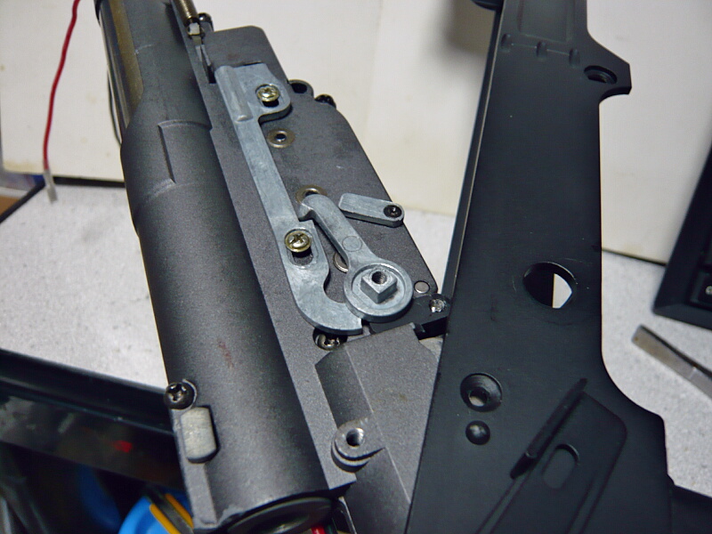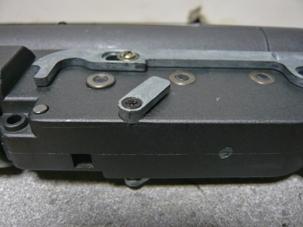 メカボックスを収める際に干渉するのでセレクターを上へ跳ね上げて干渉する部分を避けながら収めます。メカボックスをピンやネジで定位置に固定するまではセレクターは引っ掛かってまともに動かないので慌てないように。