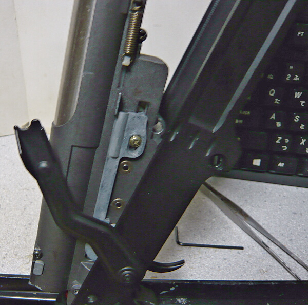 戻ってメカボックスの分解にかかります。このメカボックスはQDタイプで、後ろ側からスプリングとスプリングガイドが抜ける仕様になっています。六角ネジがあるのでレンチを入れて回してみますがビクともしません。