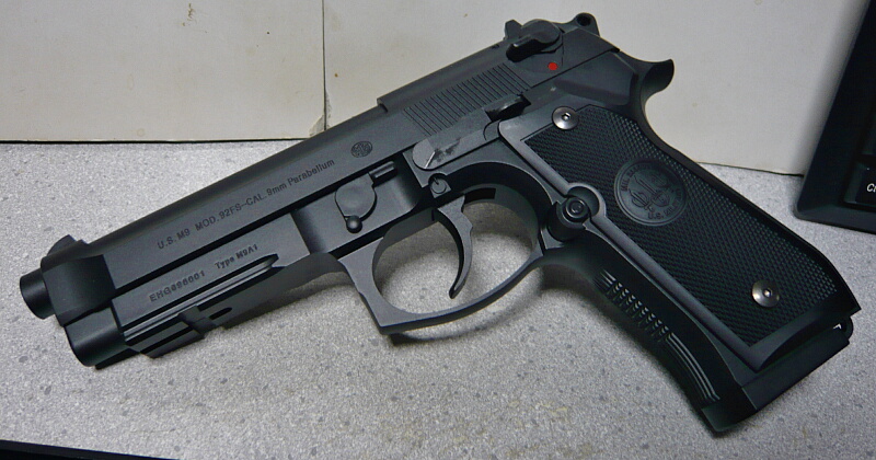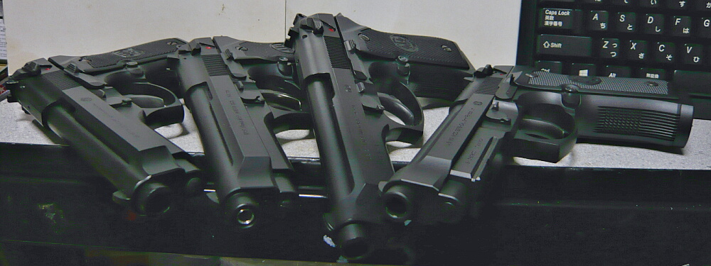 ウチにあるベレッタ92系共と。左からマルシンのモデルガンM92FS、SⅡSの固定スライドガスM9、マルイエアコキM9、電ハンM9A1。ガスブロがありませんが20年ほど前にウェスタンアームズのM92FSセンチュリオンというやつを持っていました。
