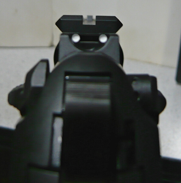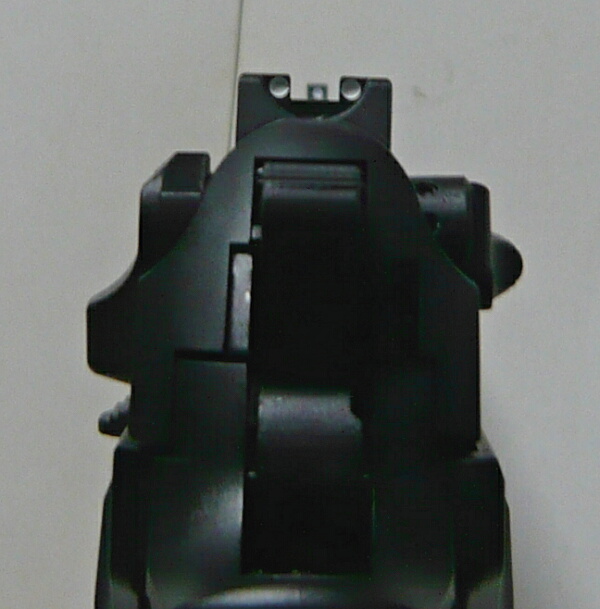 前後サイトにはホワイトドットが入っています。ちょっとカメラ位置が近かったのかフロントサイトが小さく見えますが、構えた時のサイトピクチャーはもっとフロントサイトが大きく見えます。