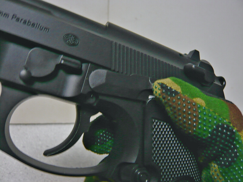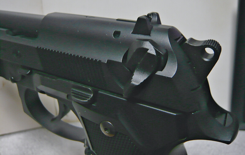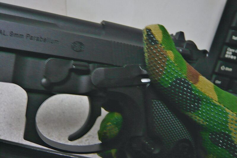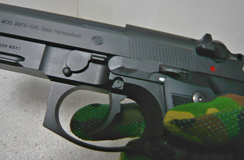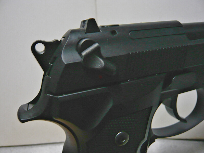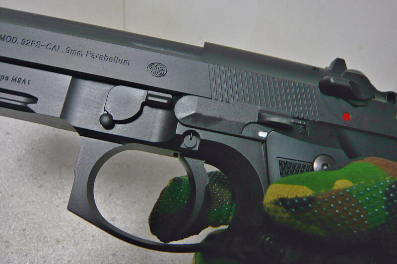 スライド後端左のデコッキングレバーは可動しますが左右連動しておらず、機能もセーフティスイッチとなっています。下へ下げる事でトリガーの操作が無効になり通電せず、という動作でトリガーはロックされません。マルイの旧ガスブロM9に慣れている人には良いですが、それ以外のM92系に慣れている人にはここがセーフティなのはちょっと違和感を感じるかもしれません。