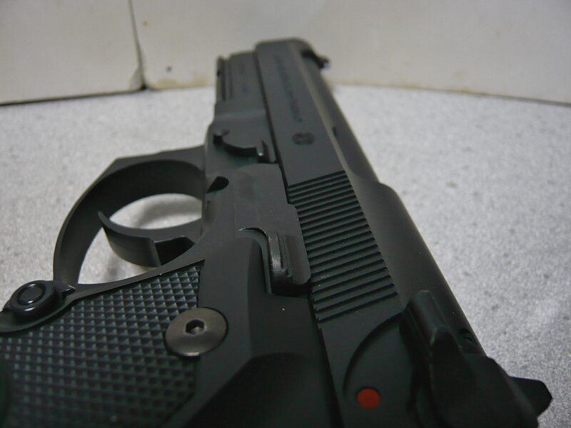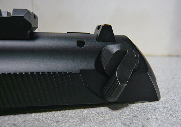 スライド後方左右には元のスライドと同様にデコッキングレバーがあり、やはりセーフティとして機能するようになっています。右側は可動はするものの左右連動しておらず、ダミーとなっています。