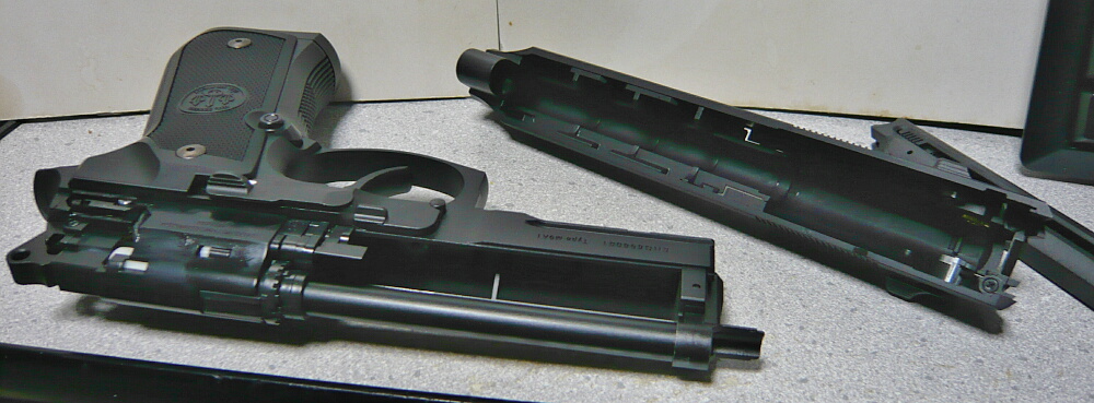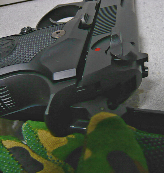 トリガーのストロークはこのくらい。ダブルアクションの位置からちょっと下がった位置までなので、マルイの旧エアコキM92Fと似たトリガー位置になっています。これもM92系のシングルアクションのトリガー位置に慣れていると引き足りなくて違和感があります。トリガータッチはただのスイッチなので軽いのですが、小さいコイルスプリングが擦れながら伸縮しているようなジョリジョリ感があり、あまり気持ちが良くありません。