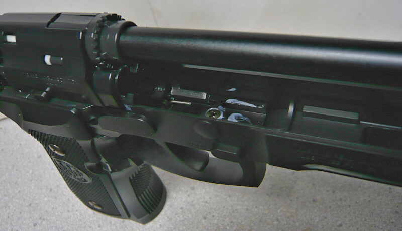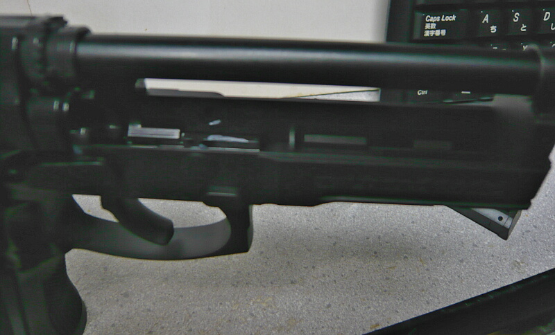 指を離すと少し前進した位置のまま下がってフルオートポジションとなります。セミオートポジションに戻す時は持ち上げて後ろへ引く必要があり、押し/引きが固いので操作はかなりしづらいものになっています。握った親指だけで操作するのは無理だろうと思います。