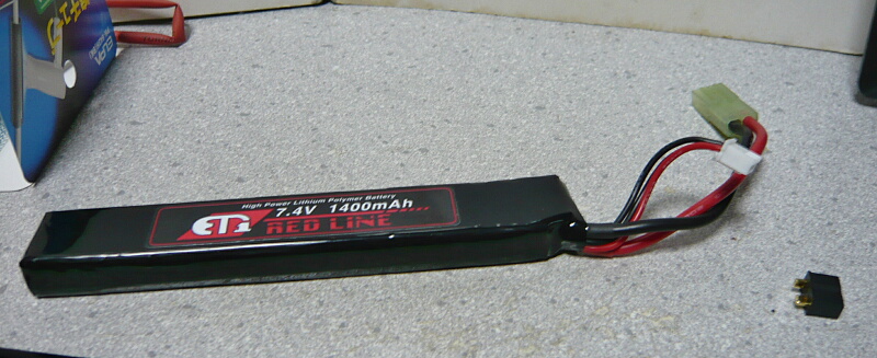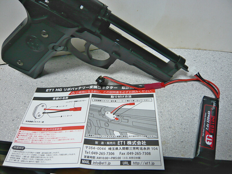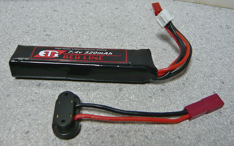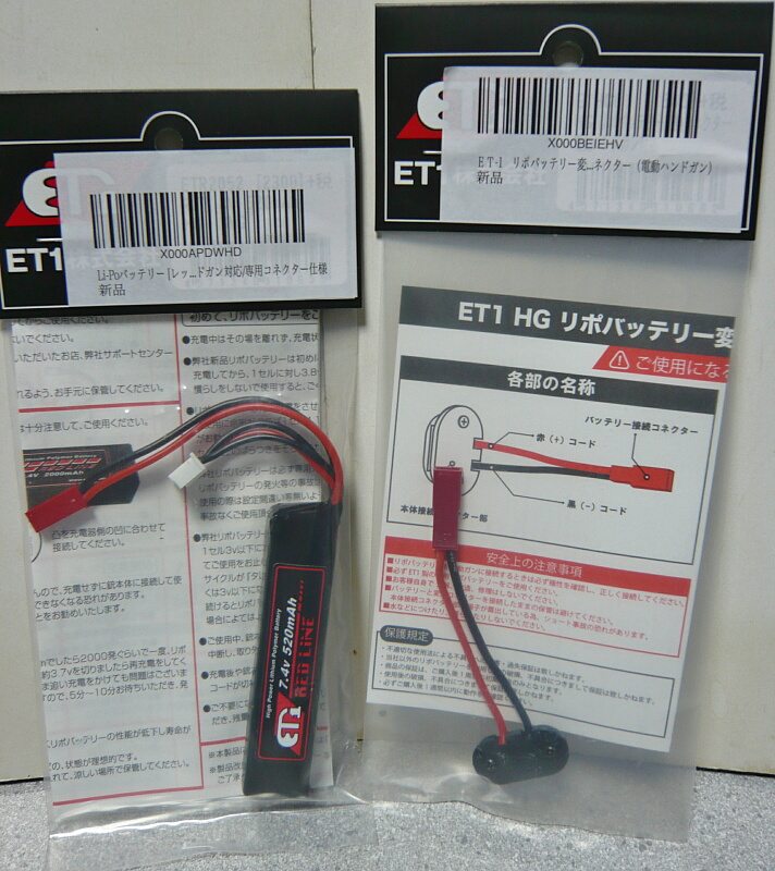 ET-1のレッドライン7.4V520mAhリポバッテリーと電動ハンドガン用の変換コネクターを同時に用意しました。定番のセットです。