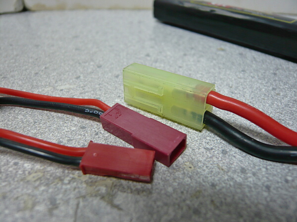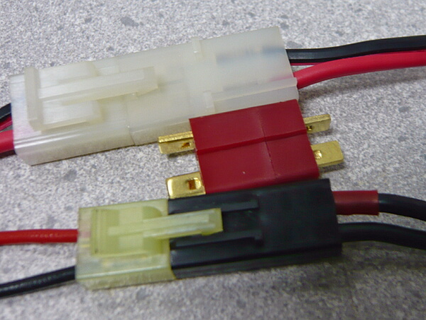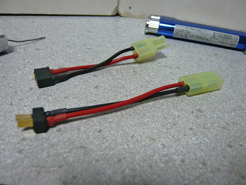 変換コネクターは銃本体のバッテリー端子に差し込む形状のものからBECコネクターと呼ばれる小型の端子の付いたコードが生えているもの。