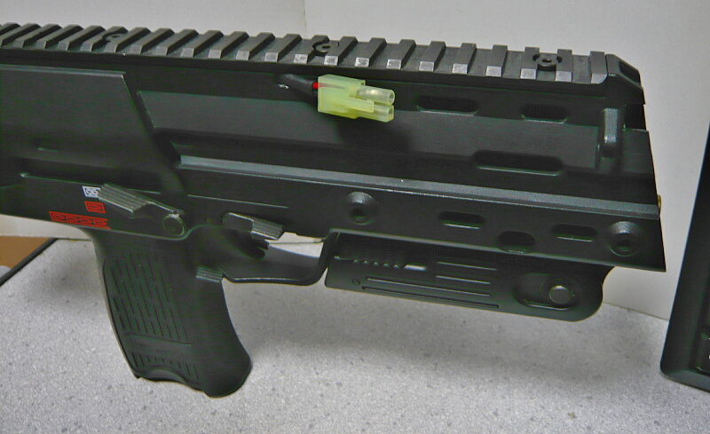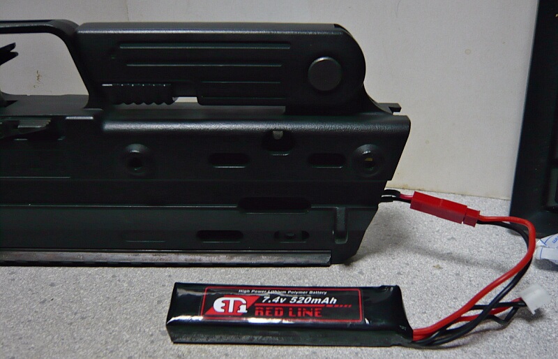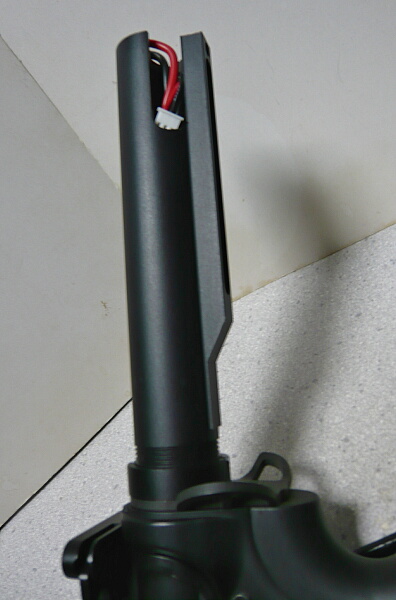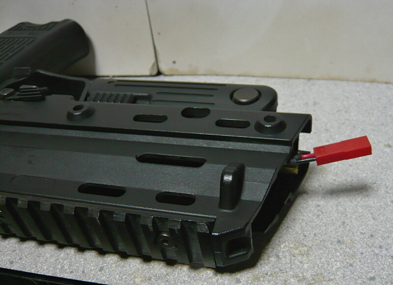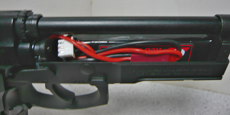 銃側の端子は斜めになったオーバル型で、どちら向きにも挿せてしまうのが怖いですが説明書通りだと配線の生えている側を斜め上に向けて差し込みます。外す時は銃側の端子のある左側にバッテリーを押し出すレバーがあるのでこれを操作すると簡単です。