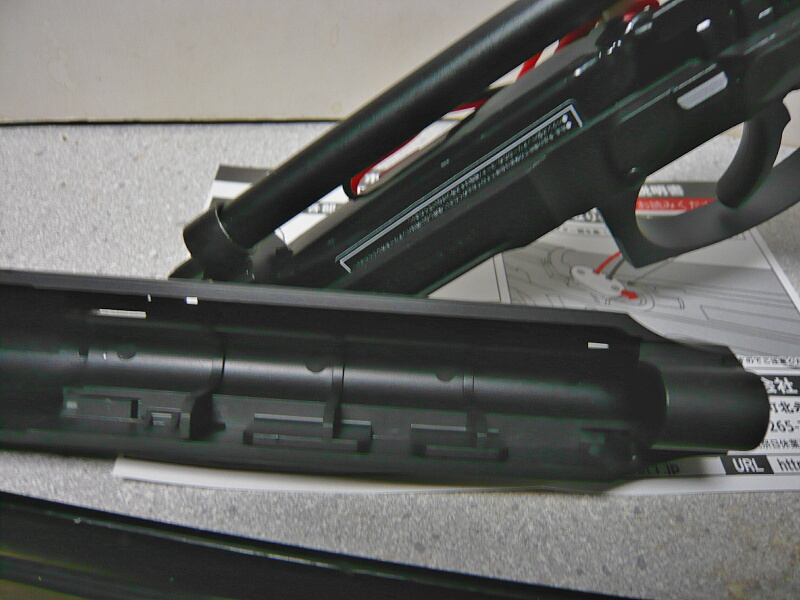 銃本体。まあ普通のマルイクオリティと申しますか、少々安っぽさはありますがダメって事はありません。表面仕上げはつや消し黒ですが少しつや消しの砂っぽさが全体的にジャリジャリしてて多少気になりました。M9A1はミリタリーモデルなので少し無骨なくらいで良いのでしょう。
