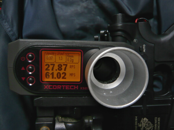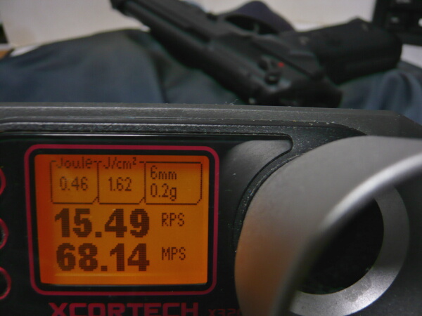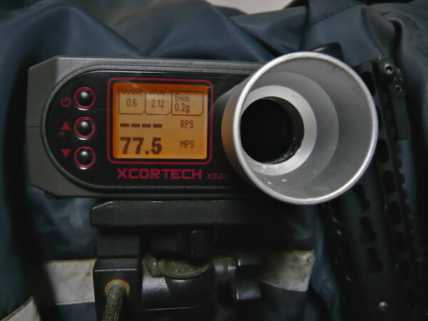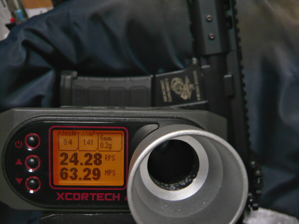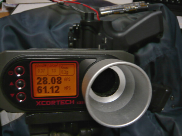 初速とサイクルチェック。初速は68m/s前後、サイクルは秒15.5発ほど。バッテリーが買いっぱで充電していないので満充電だともう少しサイクルが上がるでしょうが、これでも結構軽快に撃つ事が出来ます。発射音はコン電と似ていてウィポウィポという感じ。