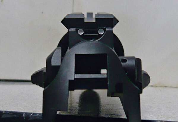 わざわざホワイトドットの入った前後アイアンサイトが元のスライド同様に付いていますが、レイルで阻害されてしまうのでレイル上にアイアンサイトの機能が持たされています。ただしこちらにはホワイトドットは入っていません。