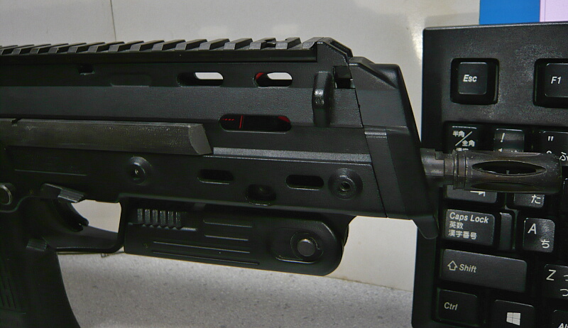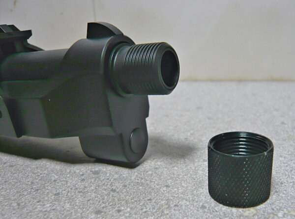 銃口には金属製のカバーが付いており、これを外すと14mm逆ネジが切られているのでここにサプレッサーを取り付ける事ができるようになっています。