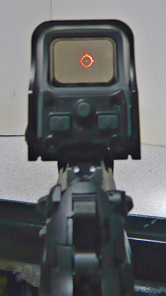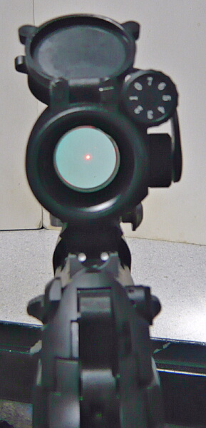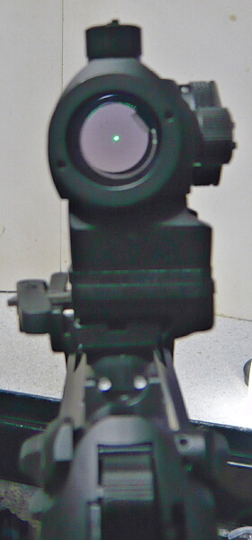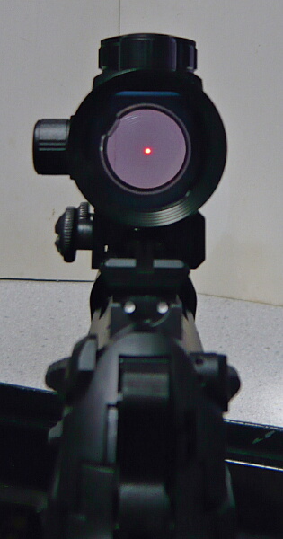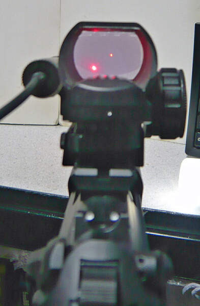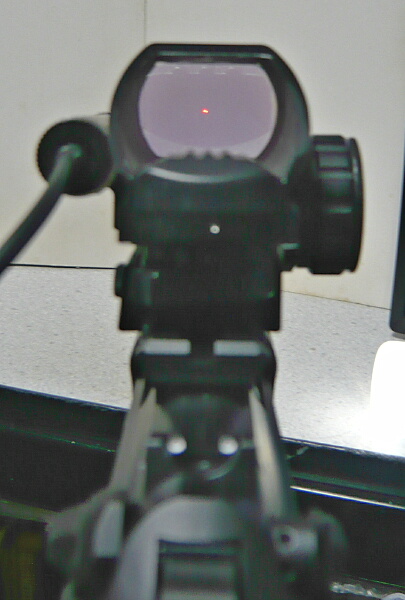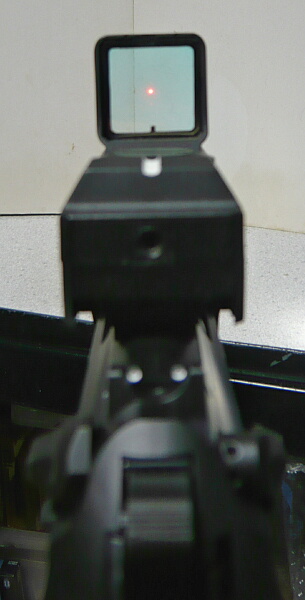 レーザーサイトを点灯したところ。中央の小さい光点がドットサイト側のドット、左下の大きい光点がレーザーサイトによって前方の衝立に照射されている光です。照射される位置が遠くなるほどドットサイトの光点と近づいてゆきます。レーザーサイトは制約が多く、熟達しないと意外に使いにくい光学機器です。