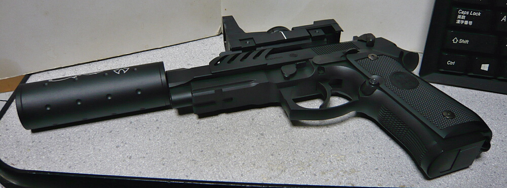 この径からはサイトピクチャーに干渉しはじめます。太いサプレッサーを取り付けた場合は光学機器を載せる必要があります。サプレッサーによる減音効果は、まあ電動ガンですので・・・「ゼロではないけどあまり効果はありません」