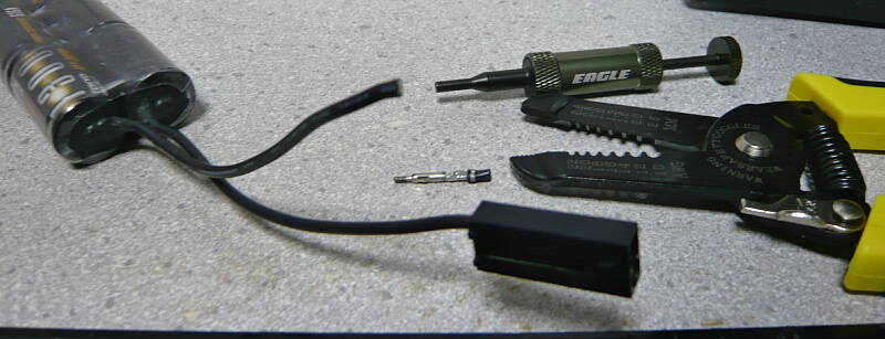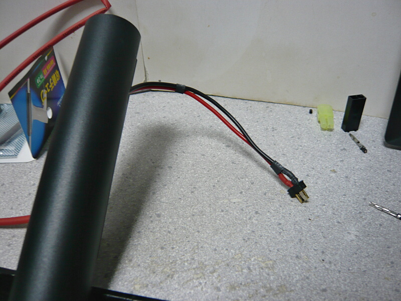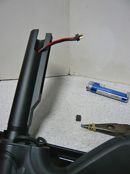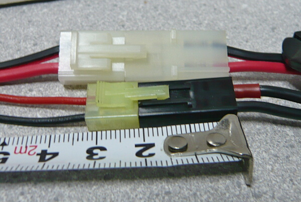 もっとも通常の使用においてそう滅多に問題が出る事は無いのですが、全体の能力を引き出す上で大容量の端子に置き換えるのも良いでしょう。タミヤコネクタには大きいラージコネクタがあり、こちらは容量は大きい(15A)ものの端子のサイズが大きく、電動ガンの限られたスペースの中ではできるだけ小さくしたいもの。