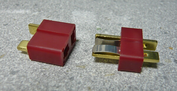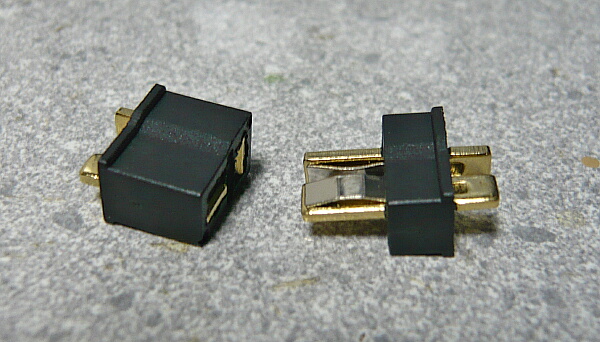 電動ガンにおいてタミヤコネクタ以外でポピュラーなのがT型コネクタ。2Pやディーンズとも呼ばれます。許容電流は50Aもありこれだけあればまず端子がボトルネックになる事はないでしょう。
